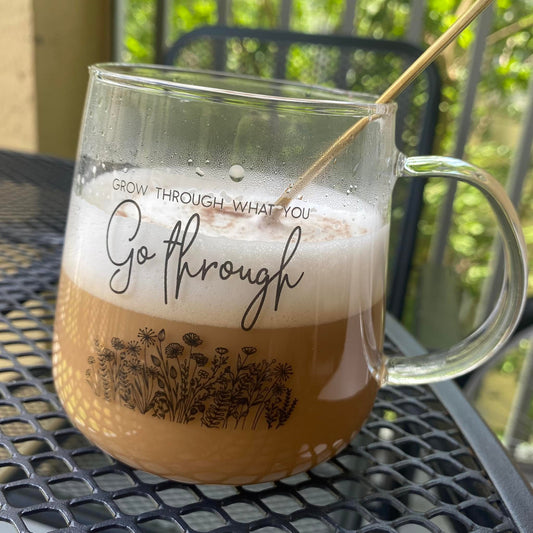 Grow through what you GO THROUGH | Inspirational Coffee Mug | Clear Mug | Comes with gold spoon