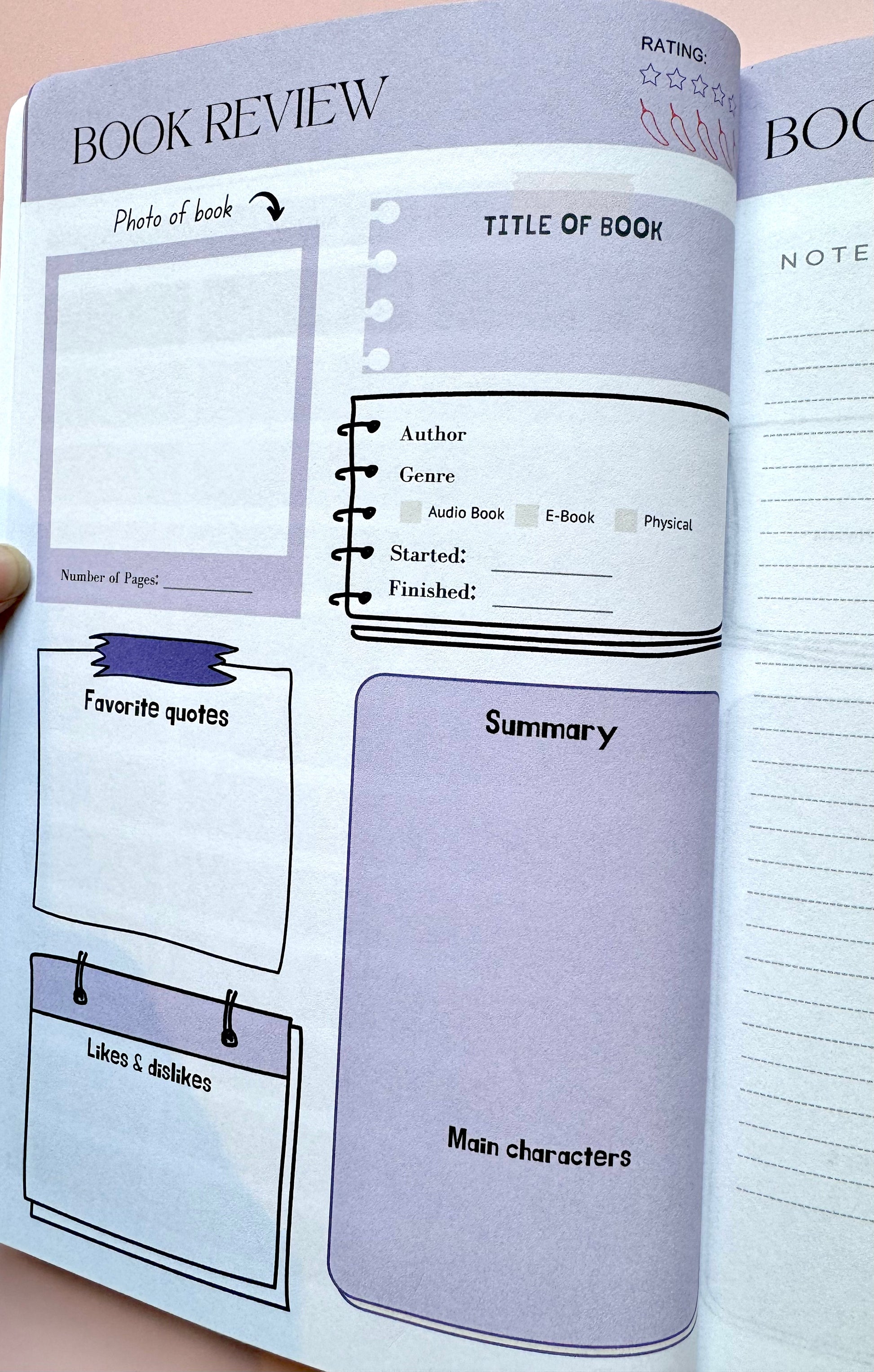 - Space for book titles, ratings, reviews, and favorite quotes