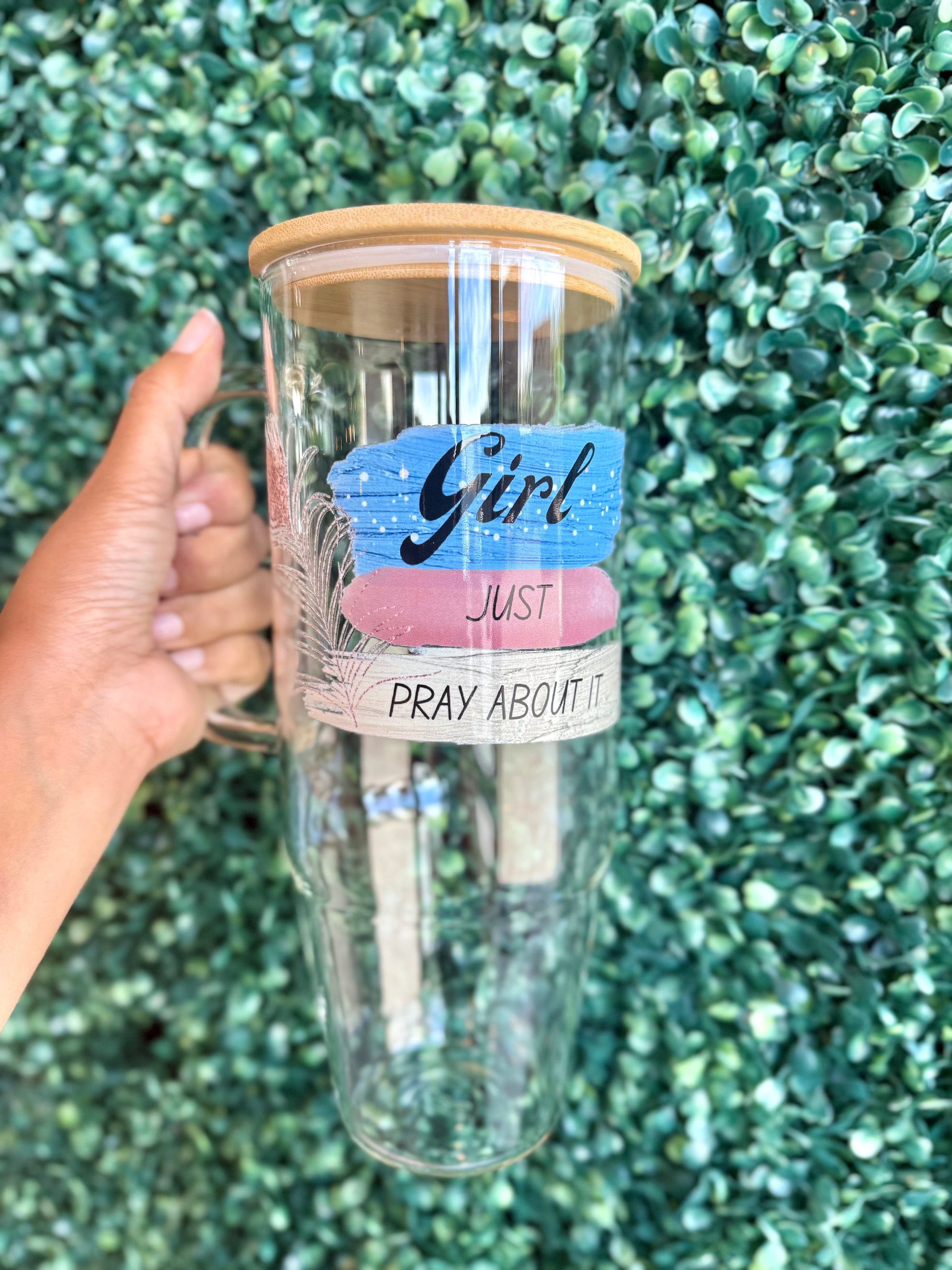 Stay refreshed and inspired with the "Girl Just Pray About It" 40oz clear glass tumbler. This roomy mug features a sturdy handle for easy grip, a stylish bamboo lid, and a convenient plastic straw—perfect for sipping your favorite drinks with a touch of faith and fun. Ideal for busy days or relaxing moments, it’s a charming companion that reminds you to keep calm and pray on!